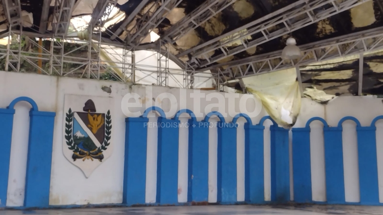El lamentable abandono de la concha acústica: sucia, con la cubierta rota y rodeada de maleza