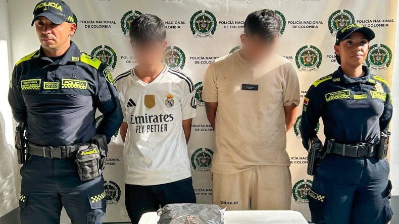 Los capturados, de 19 y 26 años, llevaban la sustancia en un bolso que intentaron abandonar al notar la presencia de las autoridades.