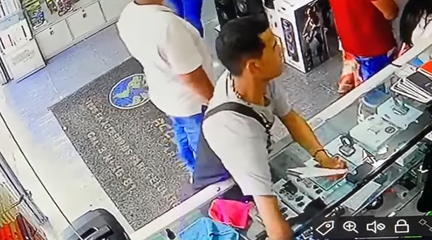 El hombre, aparentemente, se aprovecha de la amabilidad e inocencia de la vendedora y, en un descuido de ella, saca el dispositivo de la vitrina.