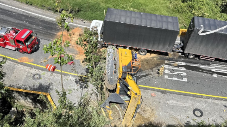 Un tractocamión que transportaba una excavadora chocó con otro camión. La maquinaria cayó a otro tramo de la carretera.